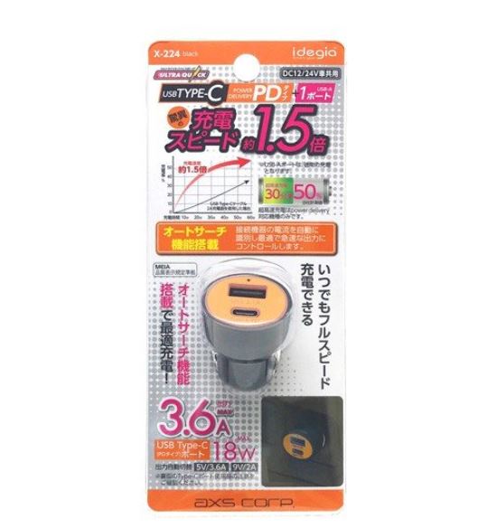 SPEC 仕様 仕様 12/24V車共用 出力: MAX 3.6A オートサーチ機能搭載 USB 1ポート PD対応ポート *出力自動切り替え 5V/3.1A, 9V/2A, 12V/1.5A 品番 X-224 品名 3.6A PD&USB 2ポートチャージャー カラー ブラック JANコード 4562112582240 パッケージサイズ H180×W75×D52(mm)