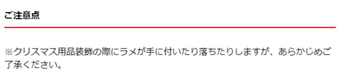 カラーご注意点※クリスマス用品装飾の際にラメが手に付いたり落ちたりしますが、あらかじめご了承ください。