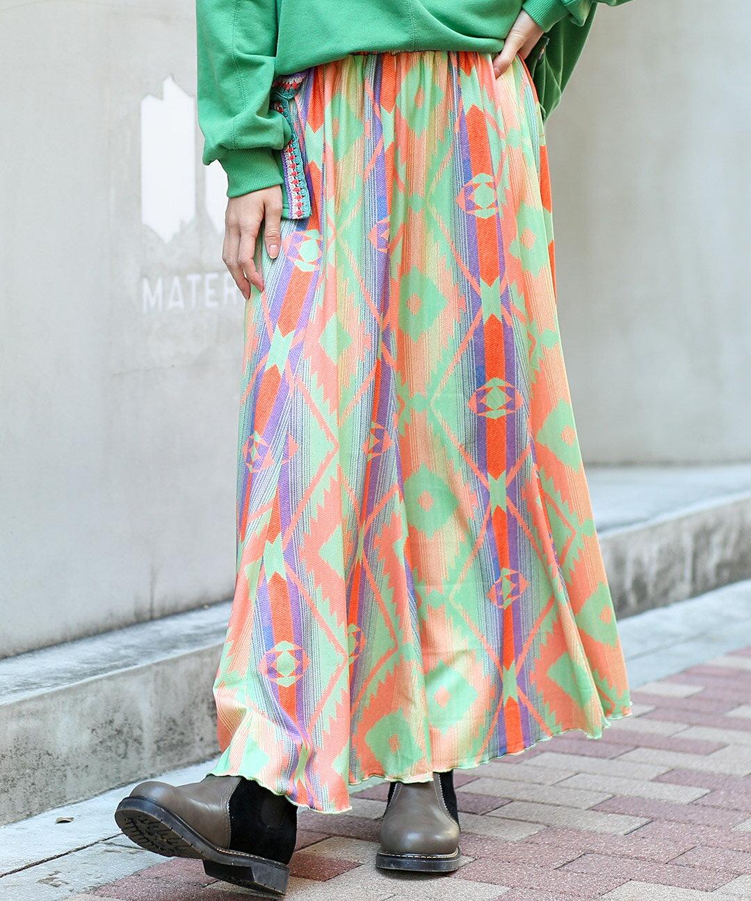 中南米のラグや織り物などのファブリックをイメージした、独特な柄を全面にプリント!歩くたびに美しいドレープを描くように、全体にギャザーと切り替えを入れました。