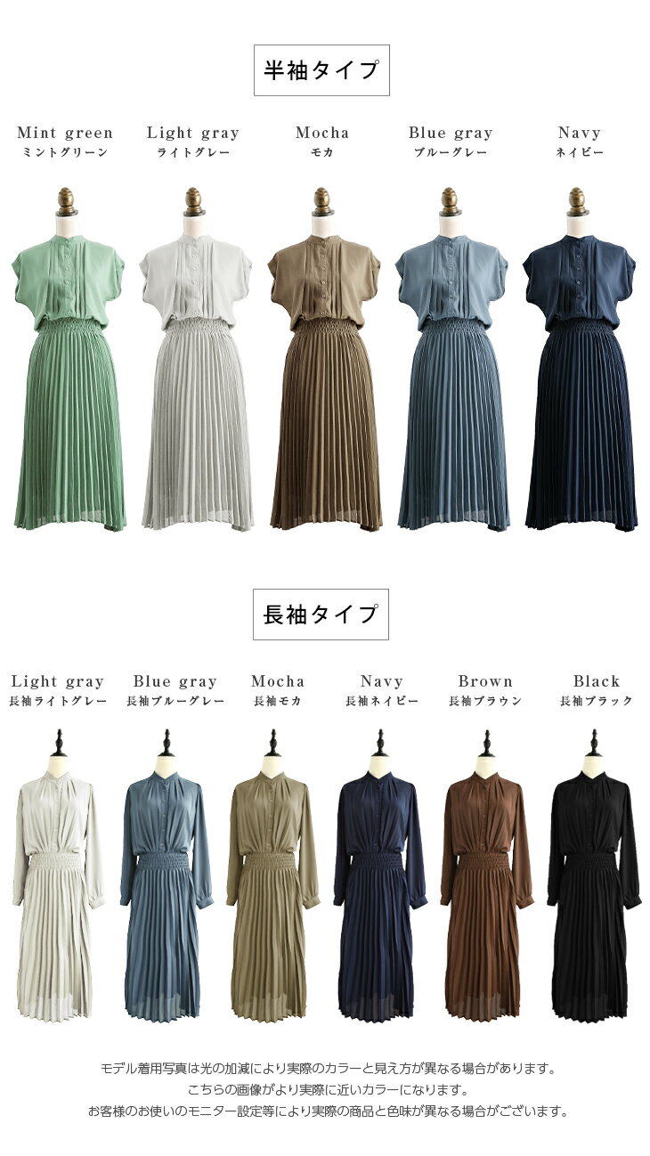 プリーツワンピース ワンピース 長袖 半袖 レディース マキシ丈 ロング丈 スタンドカラー 可愛い 清楚 上品 オフィス OL きれいめ ゆったり リラックス 女性 レディース マニッシュ トレンド おしゃれ おすすめ お洒落 韓国ファッション 春夏 M L サイズ 20代 30代 40代 50代 デート お出かけ 遊び 無地 ミントグリーン ライトグレー モカ ブルーグレー ネイビー 長袖ライトグレー ブルーグレー モカ ネイビー ブラックITEMSPECカテゴリレディース > ワンピース > マキシ実寸半袖【M】バスト:96cm / 袖丈:23cm / 着丈:123cm【L】バスト:100cm / 袖丈:24cm / 着丈:124cm長袖【M】バスト:92cm / 袖丈:60cm / 着丈:125cm / 肩幅:34cm / ウエスト:50cm【L】バスト:96cm / 袖丈:61cm / 着丈:127cm / 肩幅:35cm / ウエスト:54cm素材ポリエステル100%生産国中国カラーミントグリーン、ライトグレー、モカ、ブルーグレー、ネイビー、長袖ライトグレー、長袖ブルーグレー、長袖モカ、長袖ネイビー、長袖ブラック、長袖ブラウンご注意点■モニターの都合上、掲載写真と実際の色が異なる場合がございます。