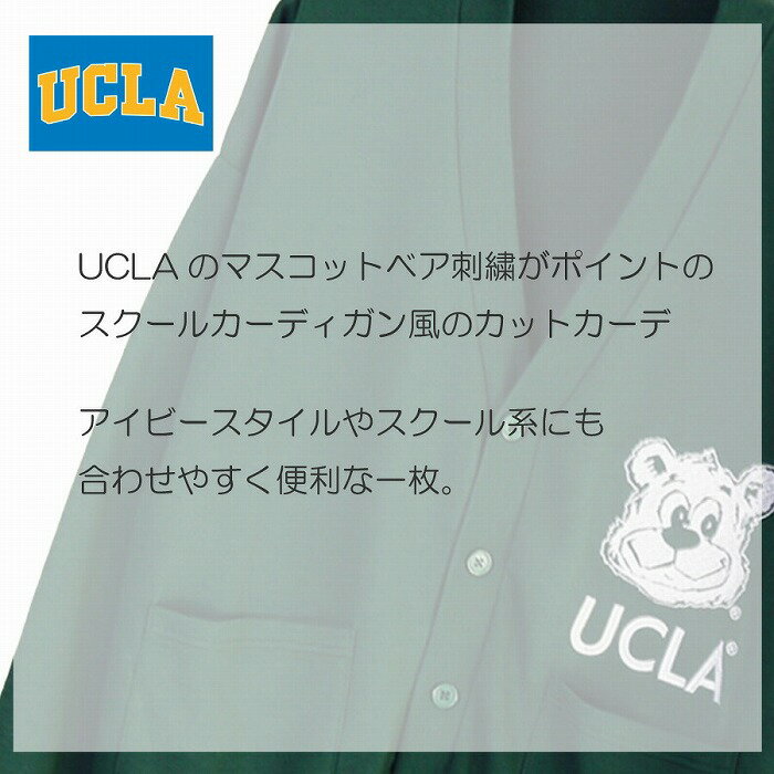 商品名 UCLA カレッジロゴ カットカーディガン アイテム詳細 UCLAのマスコットベア刺繍がポイントのスクールカーディガン風のカットカーデ ■デザイン 深いVネックUCLAのマスコットキャラクターのくまの刺繍でアメカジテイストなスウェットカーディガン ミドル丈のちょうどいい丈間と、ふわっとした軽い着心地がクセになっちゃう! ネックライン・裾・袖はピッタリフィットするリブ素材。