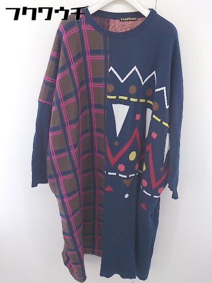 ◇ FRAPBOIS フラボア チェック デザイン 総柄 長袖 膝下丈 ニット ワンピース サイズ1 ネイビー系 マルチ レディース 【中古】