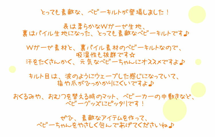 ■Wガーゼ*ベビーキルト♪【裏パイル】※96cm幅 表:裏コットン100% (表:Wガーゼ 裏:パイル 中綿:ポリエステル)