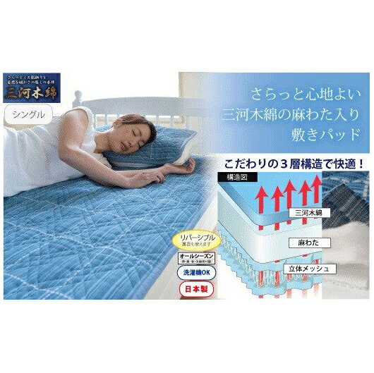 商品情報 名称 敷きパッド 内容 三河木綿麻わた敷パッド(1枚) 製品サイズ シングルサイズ 約 100×205(cm) カラー ブルー 素材 表地:綿100%(3重ガーゼ) 詰め物:麻(ラミー)100% 裏地:ポリエステル100%(立体メッシュ) 商品説明 三河木綿3重ガーゼがふっくらやわらかく、サラサラの敷きパッドです。