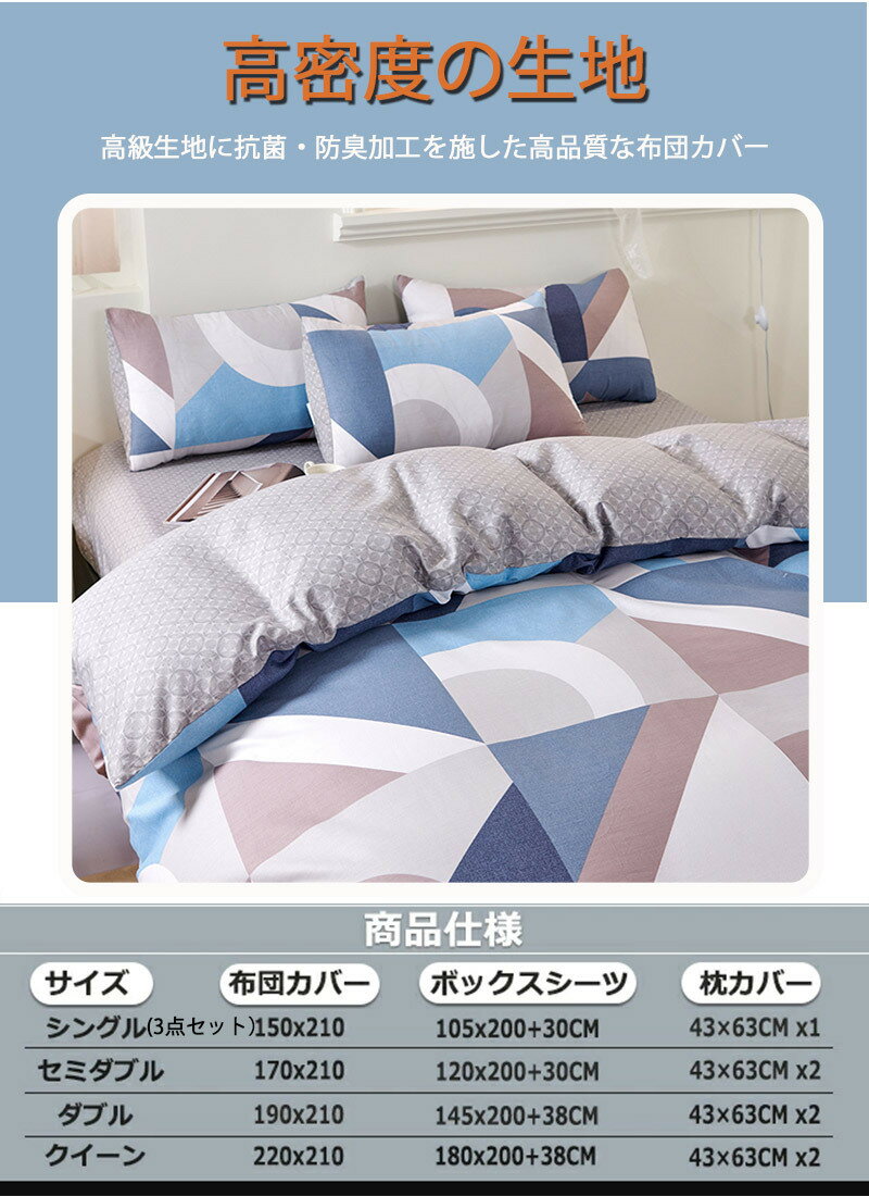 サイズ/寸法【シングル 3点セット】 布団カバー(1枚):150x210cm ボックスシーツ(1枚):105x210+30cm 枕カバー(1枚):43x63cm 【セミダブル 4点セット】 布団カバー(1枚):170x210cm ボックスシーツ(1枚):120x200+30cm 枕カバー(2枚):43cm*63cm*2点 【ダブル 4点セット】 布団カバー(1枚):190x210cm ボックスシーツ(1枚):145x200+38cm 枕カバー(2枚):43cm*63cm*2点 【クイーン 4点セット】 布団カバー(1枚):220x210cm ボックスシーツ(1枚):180x200+38cm 枕カバー(2枚):43cm*63cm*2点四季適用通気性と吸放湿性優れて、夏の場合は、汗をかいても素早く湿気を吸い取り、発散してくれるのでいつでもサラサラとした肌触りです。