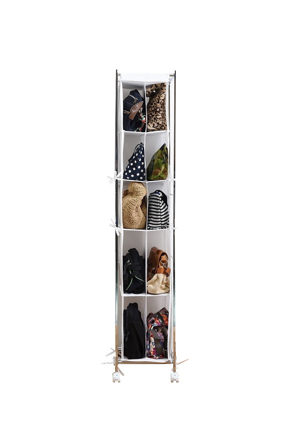 ●クローゼット内などキャスター付で置く場所を選ばないバッグ収納ラック! ●収納時に雑に置きっぱなしになるバッグ類をきれいに収納可能! ●本体前面カバーで、大事な衣類を目隠し収納できる! ●ハンドバッグやポーチなどかさばるバッグ収納に便利な収納ラック。