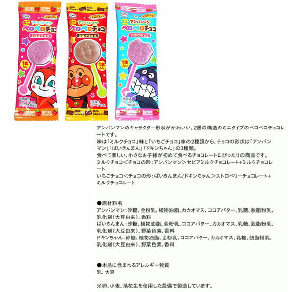 【JANコード】:49755114 【生産国】 :日本【販売メーカー】:不二家【味】:ミルク・イチゴ2種類のチョコレート【サイズ・容量・価格】1本5グラムx25本=810円【原材料】:映像をご参照ください【その他・特徴】 ※アンパンマンとその仲間たちの3種のキャラクター カラフルなスティックチョコレート【レターパック便でのご注意点】 ※レターパック1通⇒数量2迄でのお届け可能※気温上昇の為小型宅配便は溶ける恐れがございますので、 到着後は即座に冷蔵庫に保管してください。